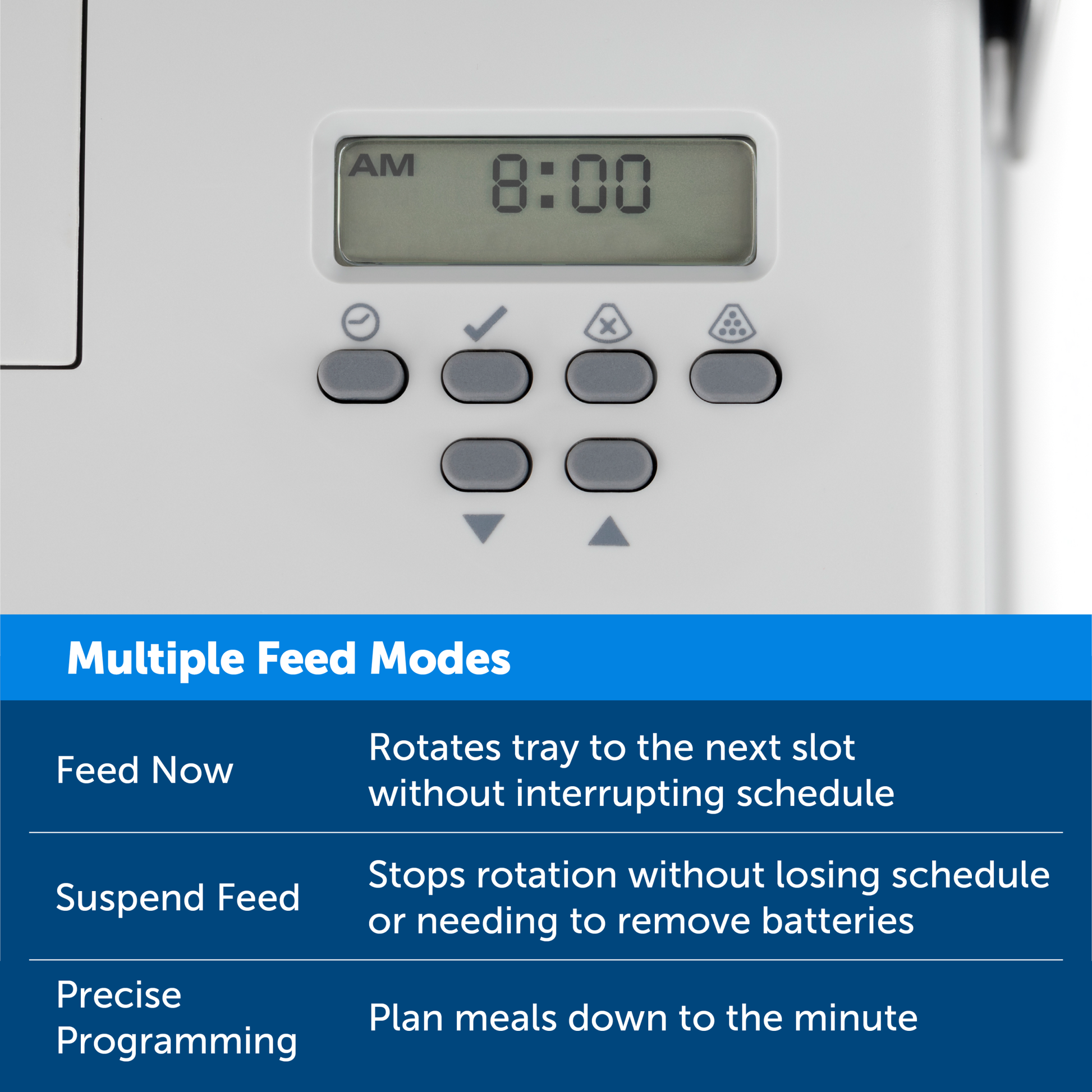 - Suspend feeding option lets you stop the feeder from serving all meals without losing your programmed schedule