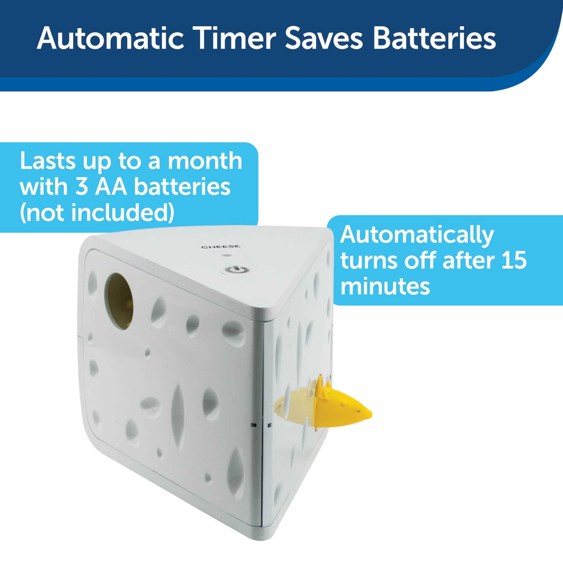 The PetSafe® Cheese Automatic Cat Toy is a fresh take on the classic cat and mouse pursuit. This interactive game of peek-a-boo includes 2 mice that pop out of a Swiss cheese block, keeping your cat busy on the hunt throughout the day. Give your cats spontaneous exercise by setting 3 separate automatic play sessions at random times throughout the day. During single play sessions, the timer automatically turns toy off after 10-15 minutes to conserve battery life. Requires 3 AA batteries (not included). Trust PetSafe® to help keep your pet healthy, safe and happy.