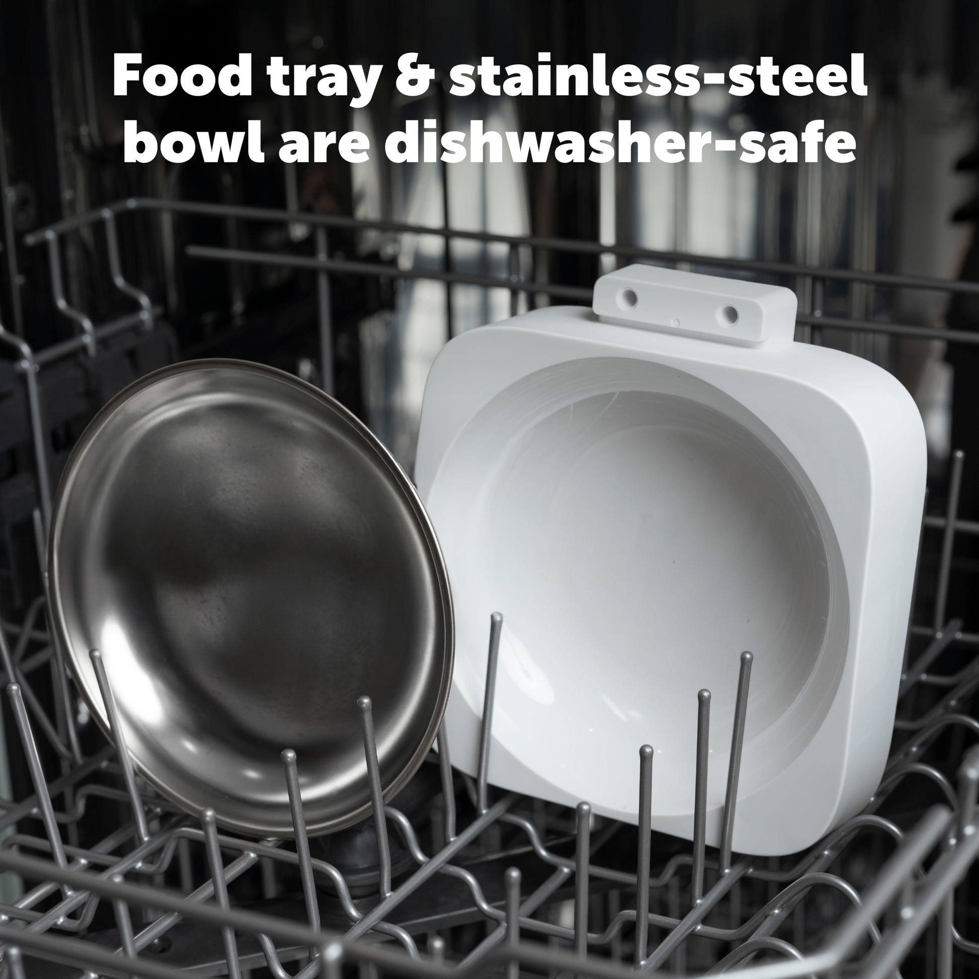 Designed with an air-tight lid and a replaceable Food-Saver Pouch, the FlexFeed Automatic Pet Feeder keeps your cat or small dog’s food fresh and ready to eat. The removable stainless-steel bowl is dishwasher safe for easy cleaning and helps prevent the buildup of bacteria which may cause chin irritation.