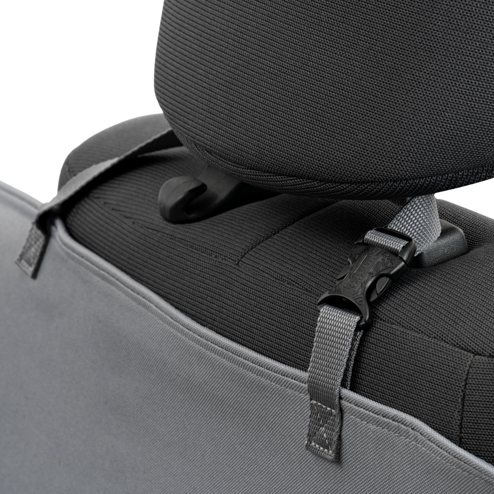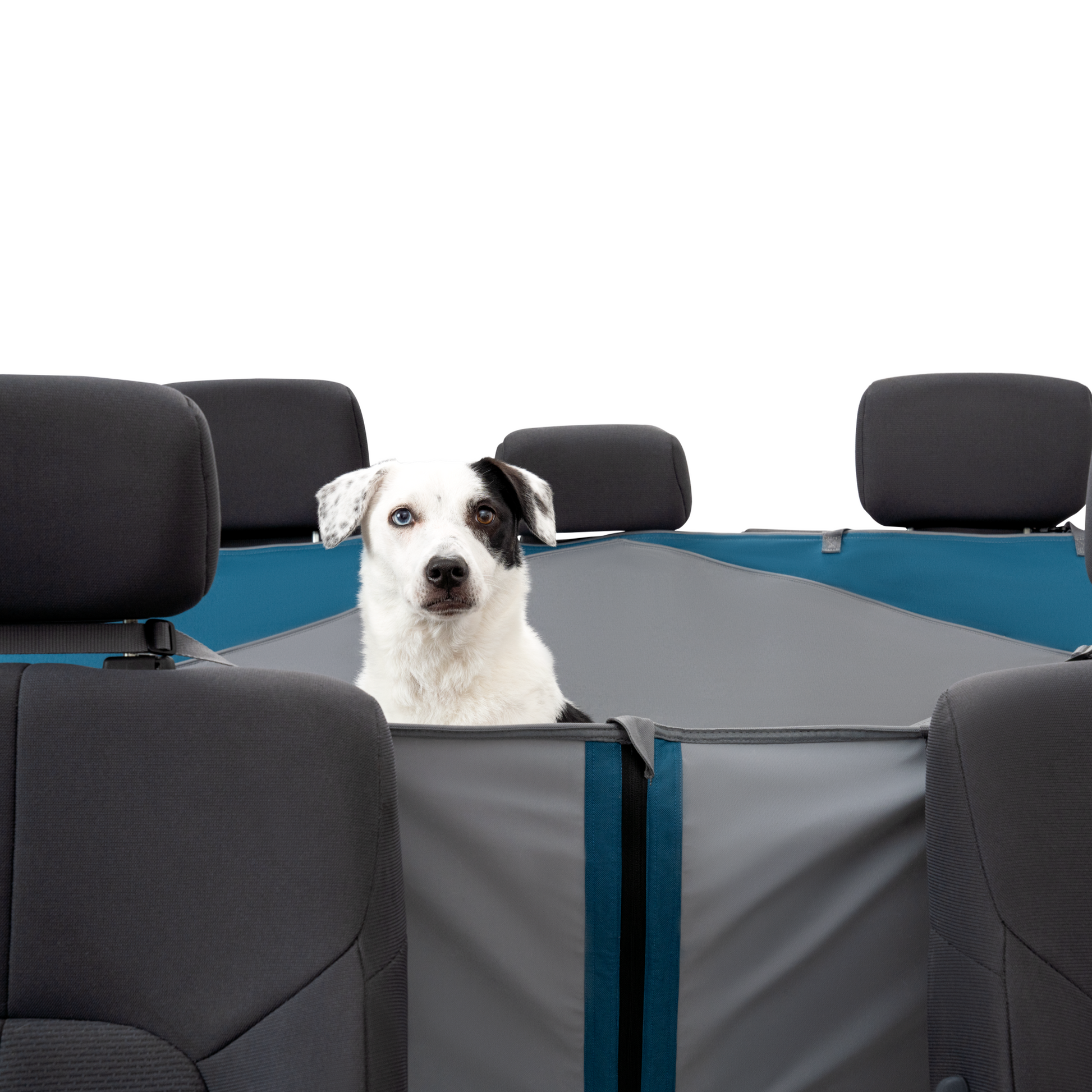 Suspended securely between the front and back seats, the Rover Hammock is a durable, waterproof barrier between your dog and any hope of automotive resale value. There are eight attachment points, for a secure fit, and a center zipper allows you to fold down half, for those times you have a human passenger back there. Openings allow for both seat belts and car seats. Meanwhile, it blocks your dog’s access to the front seat, keeping everyone safer.