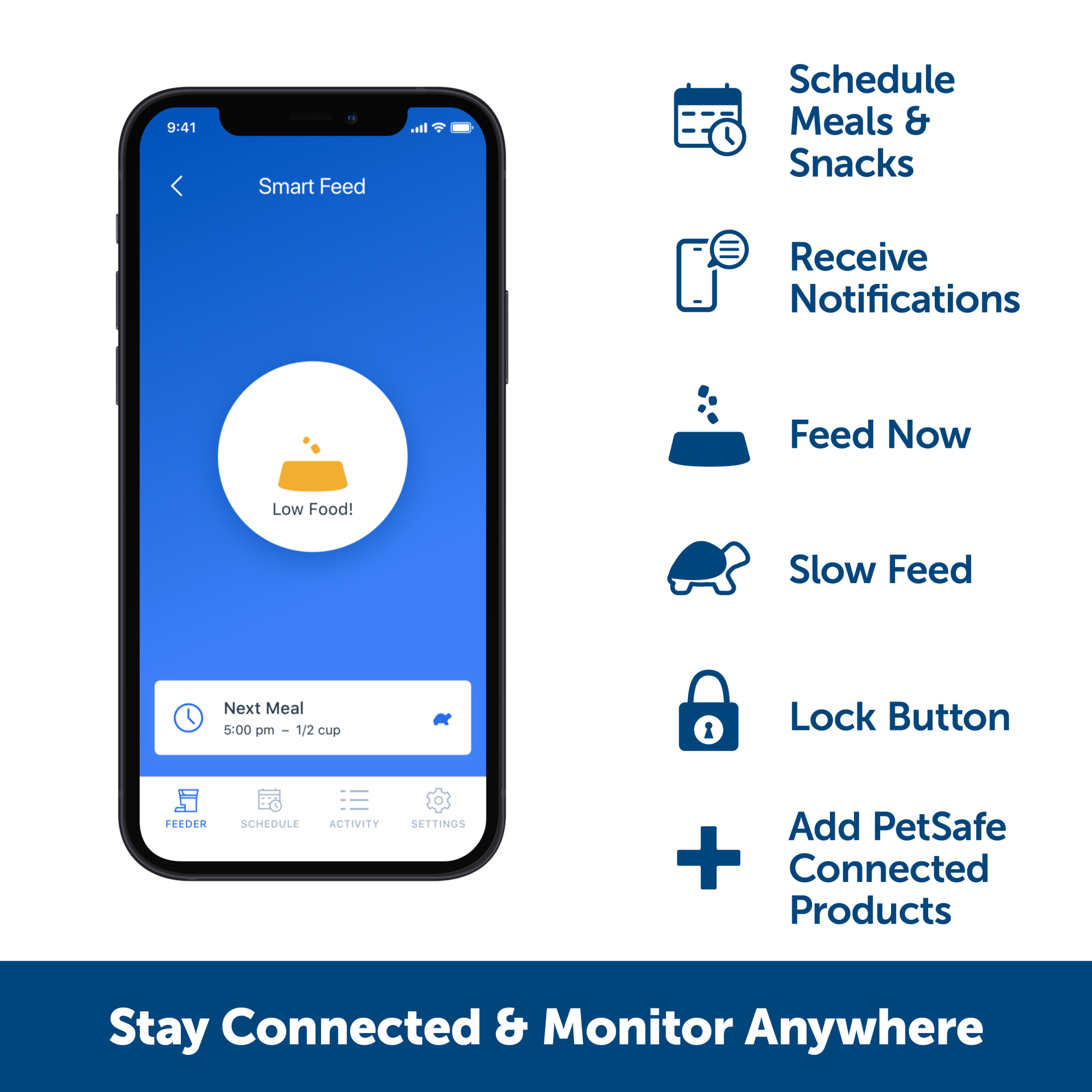 - Smart feeder connects to Wi-fi so you can feed your pet within the My PetSafe® app